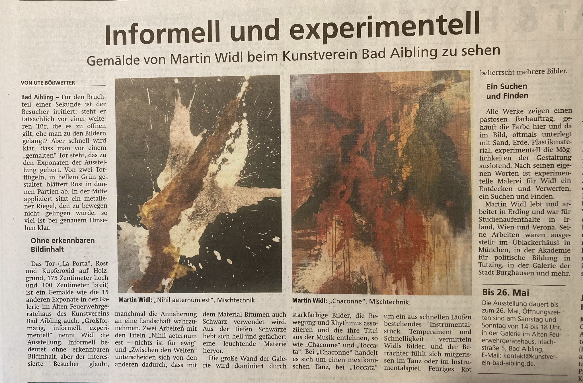 Der Erdinger Künstler Martin Widl verarbeitet Einflüsse und strukturelle Gegebenheiten aus der Natur sowie flüchtige Eindrücke und Stimmungen. Spontanität und Experimentierfreudigkeit bilden die Basis seiner Arbeitsweise. Diese inneren und äußeren Prozesse versucht Martin Widl in ihrer Gesamtheit in den Arbeitsprozess einfließen zu lassen und auf Leinwand festzuhalten.